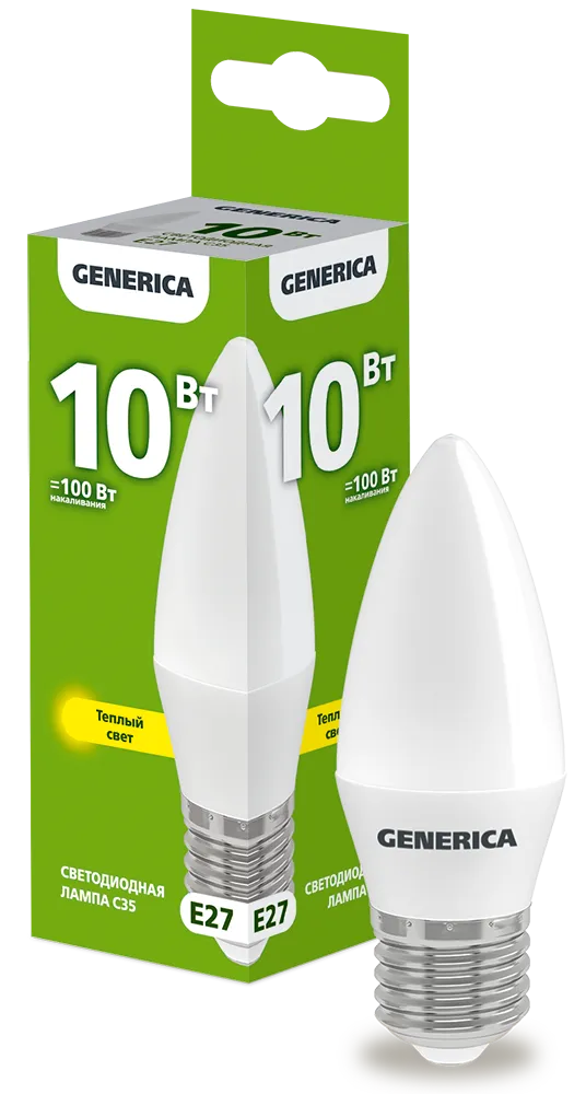 Наименование в каталоге Лампа светодиодная C35 свеча 10Вт 230В 3000К E27 GENERICA
