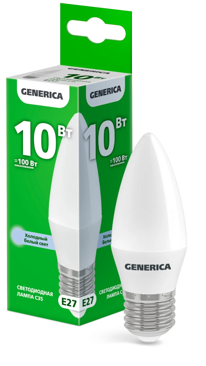 Наименование в каталоге Лампа светодиодная C35 свеча 10Вт 230В 6500К E27 GENERICA