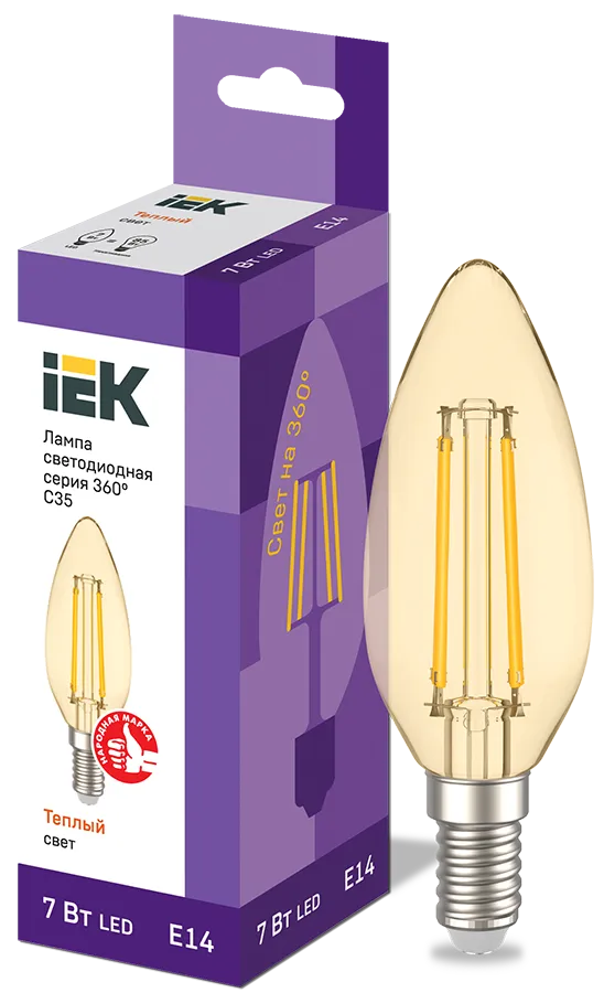 Наименование в каталоге Лампа светодиодная C35 свеча золото 7Вт 230В 2700К E14 серия 360° IEK