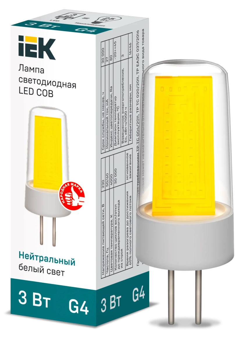 Наименование в каталоге Лампа светодиодная COB капсула 3Вт 230В 4000К керамика G4