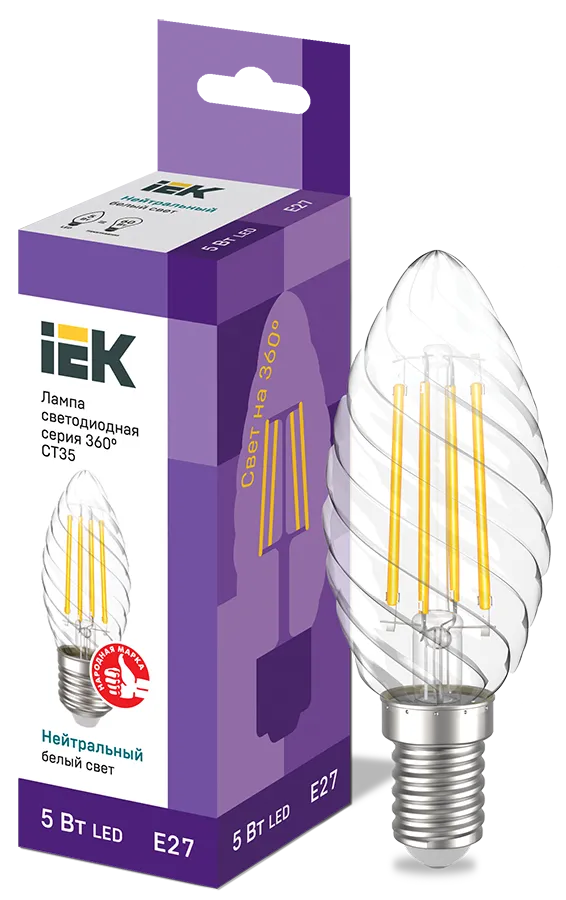 Наименование в каталоге Лампа светодиодная CT35 свеча витая прозрачная 5Вт 230В 4000К E27 серия 360° IEK