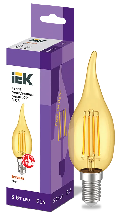 Наименование в каталоге Лампа светодиодная CВ35 свеча на ветру золото 5Вт 230В 2700К E14 серия 360° IEK
