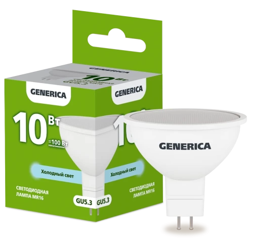 Наименование в каталоге Лампа светодиодная MR16 софит 10Вт 230В 6500К GU5.3 GENERICA