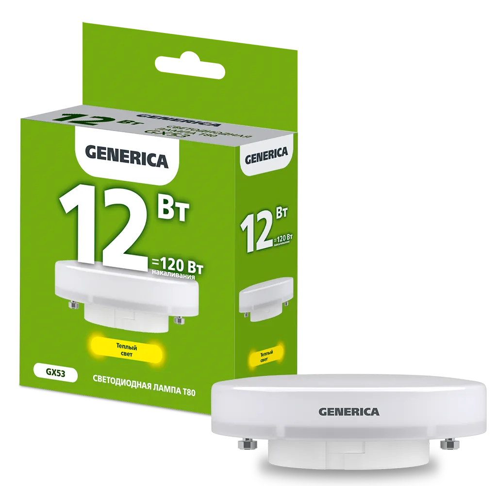 Наименование в каталоге Лампа светодиодная T80 таблетка 12Вт 230В 3000К GX53 GENERICA
