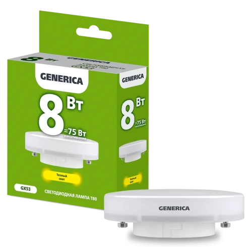 Наименование в каталоге Лампа светодиодная T80 таблетка 8Вт 230В 3000К GX53 GENERICA