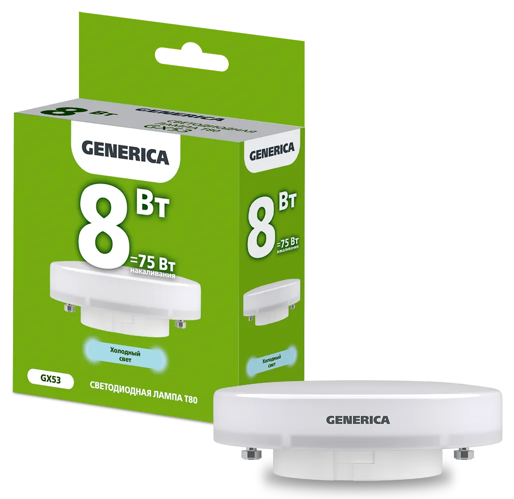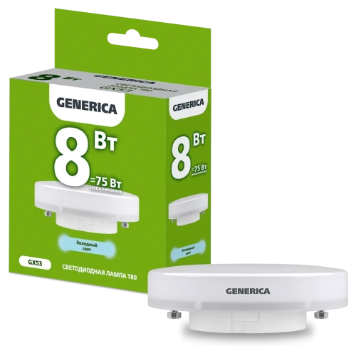 Наименование в каталоге Лампа светодиодная T80 таблетка 8Вт 230В 6500К GX53 GENERICA