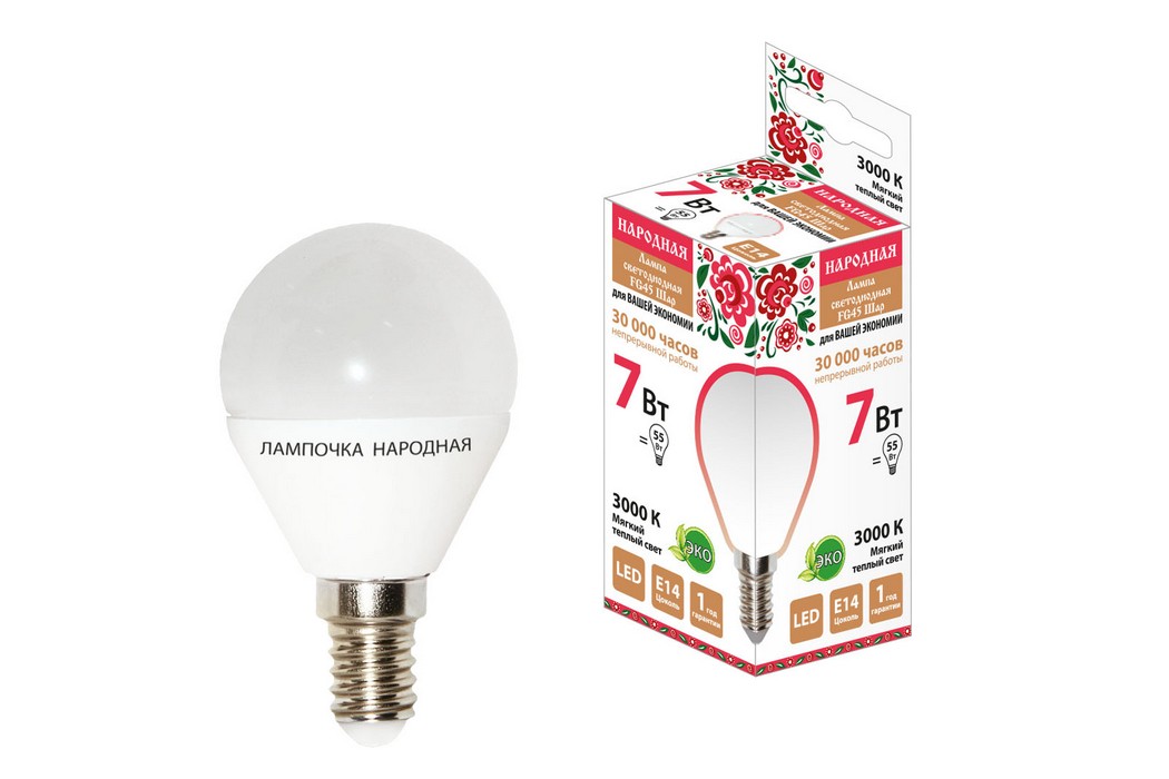 Наименование в каталоге Лампа светодиодная FG45-7 Вт-230 В-3000 К-E14 Народная