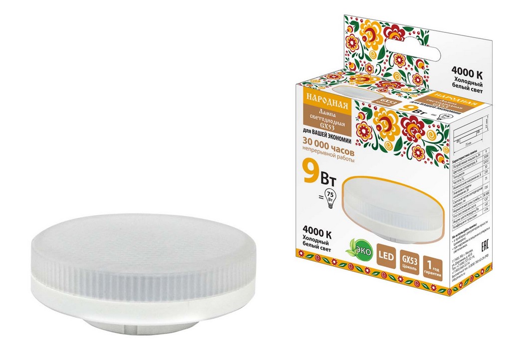 Лампа светодиодная GX53-9 Вт-230 В-4000 К Народная