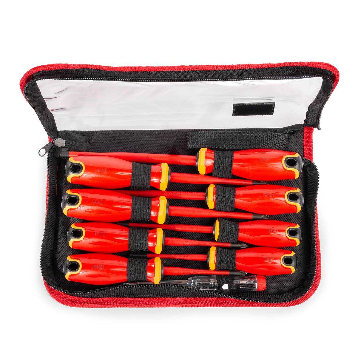 Описание Профессиональный инструмент, который предназначен для работы с электротехническим оборудованием и электрическими соединениями. Набор состоит из 9 отверток разного размера и формы, которые имеют диэлектрическое покрытие для защиты от поражения электрическим током. Все инструменты изготовлены из качественной стали и имеют удобную ручку для комфортной работы. Набор поставляется в прочном кейсе для удобного хранения и транспортировки.