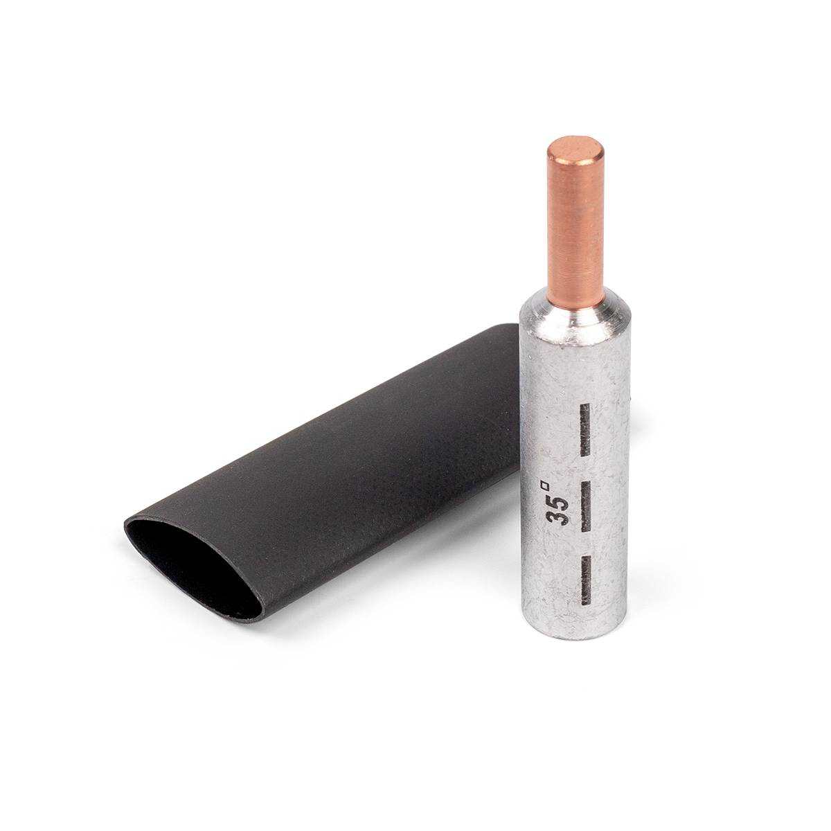 Описание Предназначены для оконцевания опрессовкой алюминиевых кабелей и проводов и последующего подключения их к выводам автоматических выключателей и прочим устройствам с ограниченной шириной контактной клемм. Каждый набор состоит из пяти алюмомедных штыревых наконечников и термоусаживаемых манжет с клеевым слоем. Материал наконечников - электротехнический алюминий марки АД1 и медь марки М1. Материал термоусадочной трубки - полиолефин, не поддерживает горение. Медная и алюминиевая части наконечника соединены между собой методом фрикционной сварки и обеспечивают контакт металлов на молекулярном уровне. Термоусадочная трубка усаживается поверх опрессованного соединения. Термоусадочные трубки с клеевым слоем и коэффициентом усадки 3 -1 обеспечивают полную герметизацию и изоляцию соединений. На трубной части наконечников нанесена разметка, определяющая местоположение и количество опрессовок. Обеспечивают прямое подключение проводов СИП к автомату без использования дополнительных приспособлений