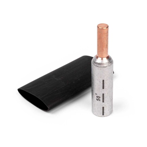 Описание Предназначены для оконцевания опрессовкой алюминиевых кабелей и проводов и последующего подключения их к выводам автоматических выключателей и прочим устройствам с ограниченной шириной контактной клемм. Каждый набор состоит из пяти алюмомедных штыревых наконечников и термоусаживаемых манжет с клеевым слоем. Материал наконечников - электротехнический алюминий марки АД1 и медь марки М1. Материал термоусадочной трубки - полиолефин, не поддерживает горение. Медная и алюминиевая части наконечника соединены между собой методом фрикционной сварки и обеспечивают контакт металлов на молекулярном уровне. Термоусадочная трубка усаживается поверх опрессованного соединения. Термоусадочные трубки с клеевым слоем и коэффициентом усадки 3 -1 обеспечивают полную герметизацию и изоляцию соединений. На трубной части наконечников нанесена разметка, определяющая местоположение и количество опрессовок. Обеспечивают прямое подключение проводов СИП к автомату без использования дополнительных приспособлений