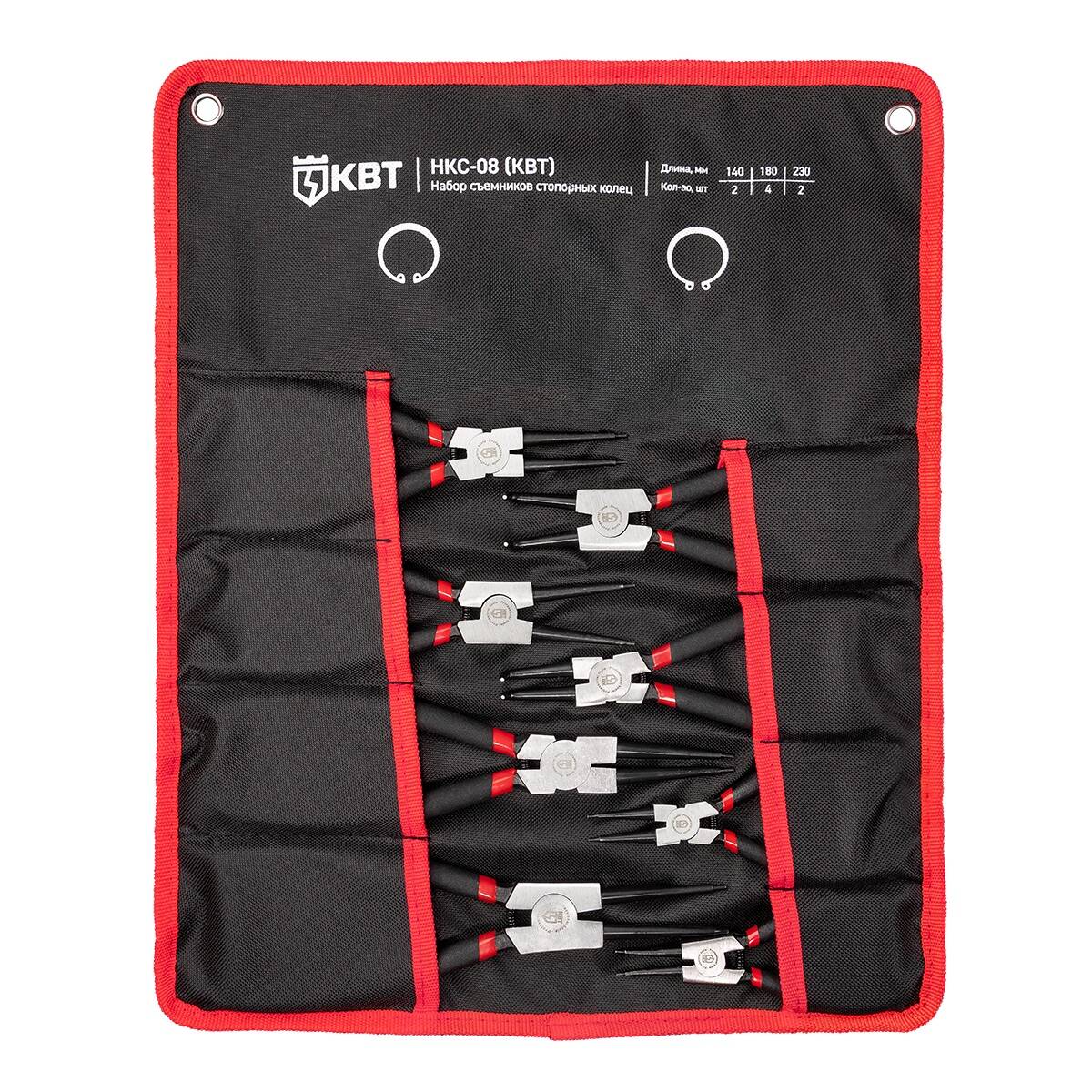 Описание Состав набора - КВП МАСТЕР 140 мм. КНП МАСТЕР 140 мм. КВП МАСТЕР 180 мм. КНП МАСТЕР 180 мм. КВИ МАСТЕР 180 мм. КНИ МАСТЕР 180 мм. КВП МАСТЕР 230 мм. КНП МАСТЕР 230 мм. Типы стопорных колец внутренней и наружной установки. Диаметр стопорных колец - КВП 140 мм, КНП 140 мм - 6 -17 мм,. КВП 180 мм, КНП 180 мм, КВИ 180 мм, КНИ -180 мм - 19 -60 мм,. КВП 230 мм, КНП 230 мм - 32 -82 мм. Материал рабочей части - высококачественная инструментальная сталь. Обработка поверхности - воронение и лакировка. Нескользящие двухкомпонентные рукоятки. Прочная и удобная раскладная сумка с ремнем -липучкой и крепежными отверстиями для размещения на стенде. Вес набора - 1.56 кг