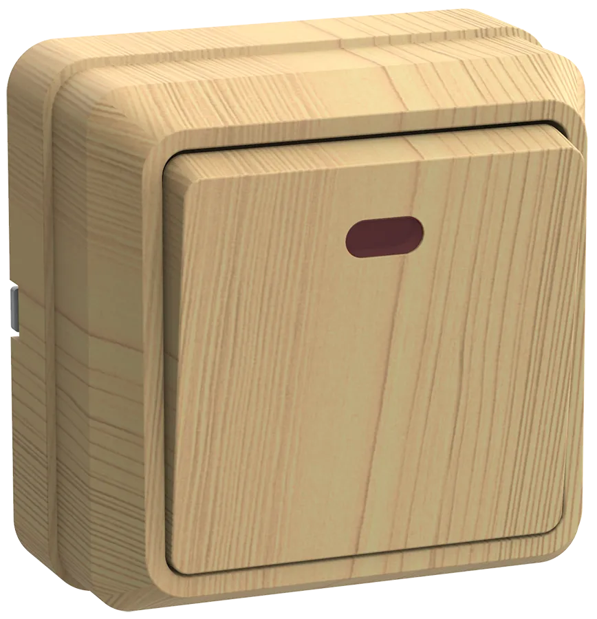 Наименование в каталоге ОКТАВА Выключатель одноклавишный наружный сосна с индикацией 10А