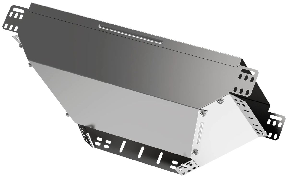 Описание Ответвитель Т-образный вертикальный вниз боковой предназначен для организации Т-образного отвода кабельной трассы вниз с изменением направления лотка на 90 градусов. Аксессуар поставляется в комплекте с крышкой.Аксессуар изготовлен из стали с цинковым покрытием, нанесенным погружением изделий в расплав цинка (защитный слой цинка не менее 55 мкм).