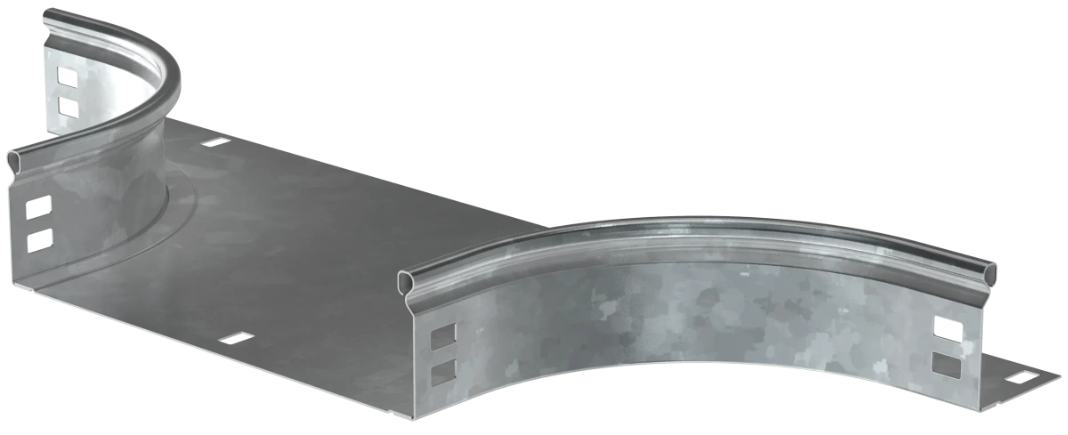 Описание Отвод Т-образный плавный предназначен для организации Т- или Х-образного горизонтального отвода кабельной трассы. Также аксессуар применяется для Т-ответвления вниз в вертикальной плоскости без применения крышки. Крышка аксессуара в комплект не входит.Аксессуар изготовлен из стали с цинковым покрытием, нанесенным погружением изделий в расплав цинка (защитный слой цинка не менее 55 мкм).
