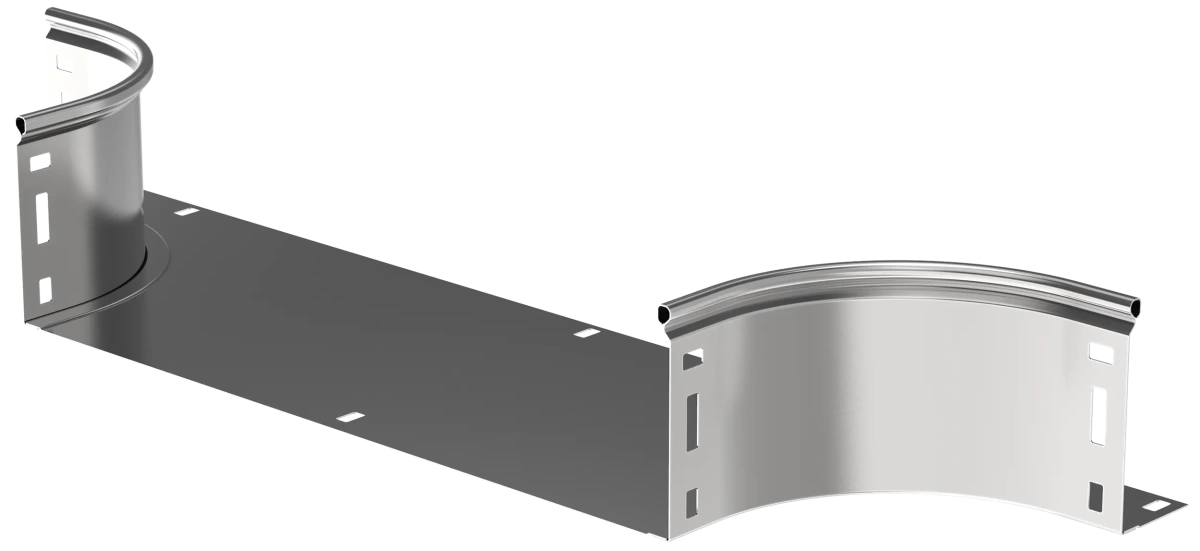 Описание Отвод Т-образный плавный предназначен для организации Т- или Х-образного горизонтального отвода кабельной трассы. Также аксессуар применяется для Т-ответвления вниз в вертикальной плоскости без применения крышки. Крышка аксессуара в комплект не входит.Аксессуар изготовлен из стали горячего цинкования методом Сендзимира (защитный слой цинка не менее 10 мкм).