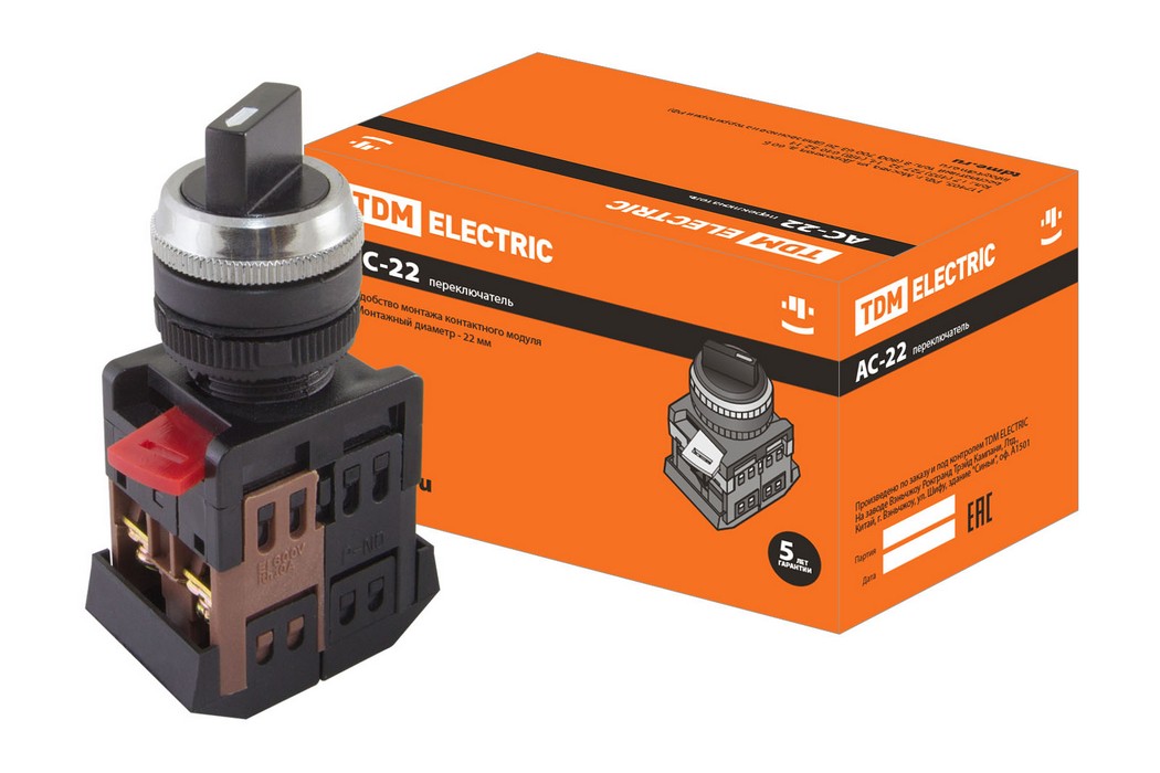 Полные технические характеристики Переключатель АС-22 на 2 фиксированных положения I-O 1з+1р TDM ELECTRIC SQ0703-0007