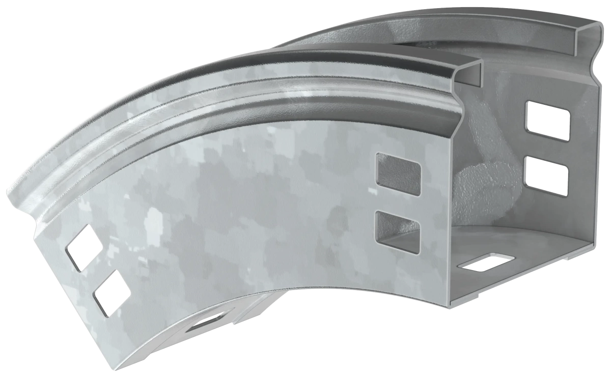 Описание Поворот на 45 градусов вертикальный внешний плавный предназначен для организации вертикального внешнего поворота кабельной трассы на 45 градусов. Крышка аксессуара в комплект не входит.Аксессуар изготовлен из стали с цинковым покрытием, нанесенным погружением изделий в расплав цинка (защитный слой цинка не менее 55 мкм).