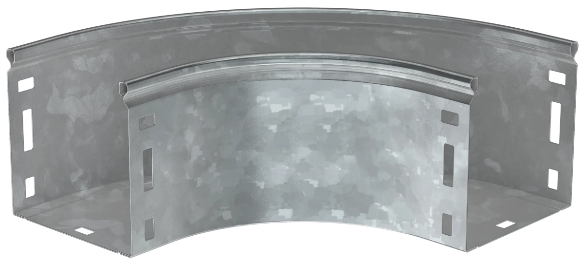 Описание Поворот на 90 градусов плавный предназначен для организации горизонтального поворота кабельной трассы на 90 градусов. Крышка аксессуара в комплект не входит.Аксессуар изготовлен из стали с цинковым покрытием, нанесенным погружением изделий в расплав цинка (защитный слой цинка не менее 55 мкм).
