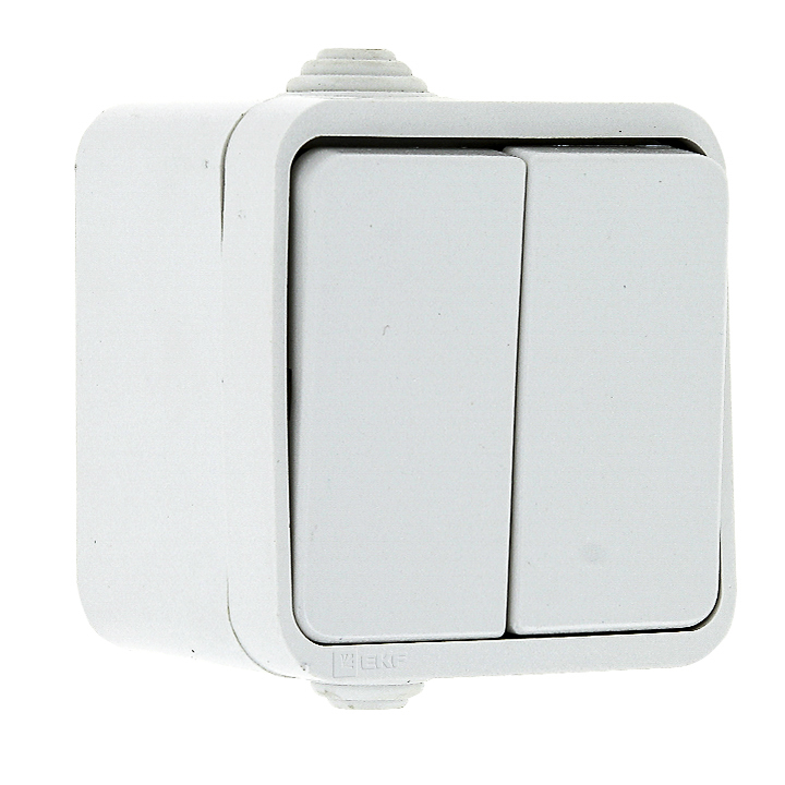 Наименование в каталоге Прага Выключатель двухклавишный 10А IP44 белый