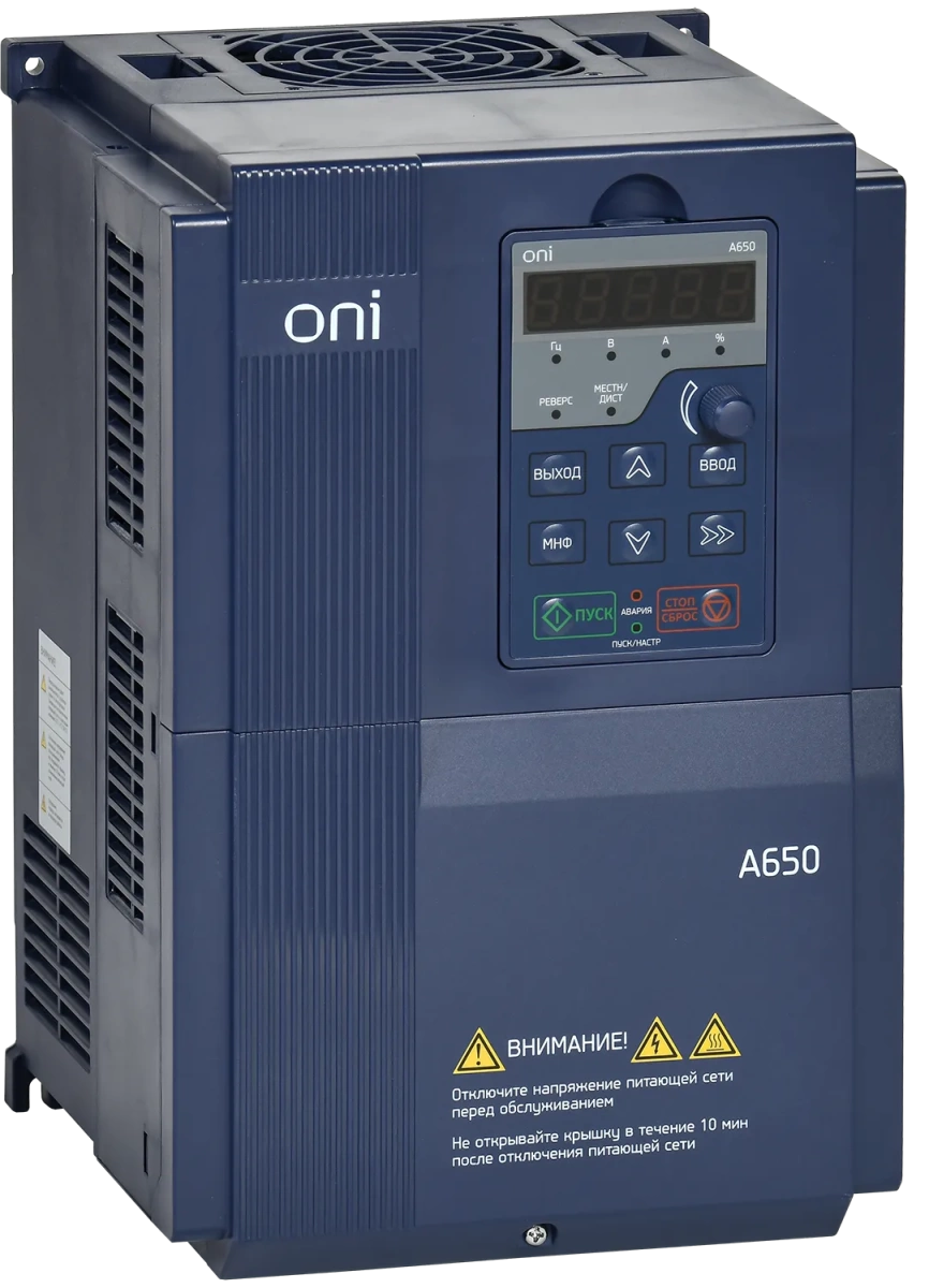 Описание Преобразователь частоты (ПЧ) ONI A650 разработан специально для применения в системах вентиляции и насосных установках.Уже в базовой конфигурации содержит специальную плату каскадного управления насосами. Позволяет объединить до 8 насосов в единый каскад. Модернизированная версия 2023 г. отличается более компактными размерами, высокой теплостойкостью силовой платы, улучшенной независимой системой вентиляции. Кроме того ПЧ А650 обладает дополнительными режимами работы, в т.ч. пожарный режим, мулти мастер, мульти переменный.