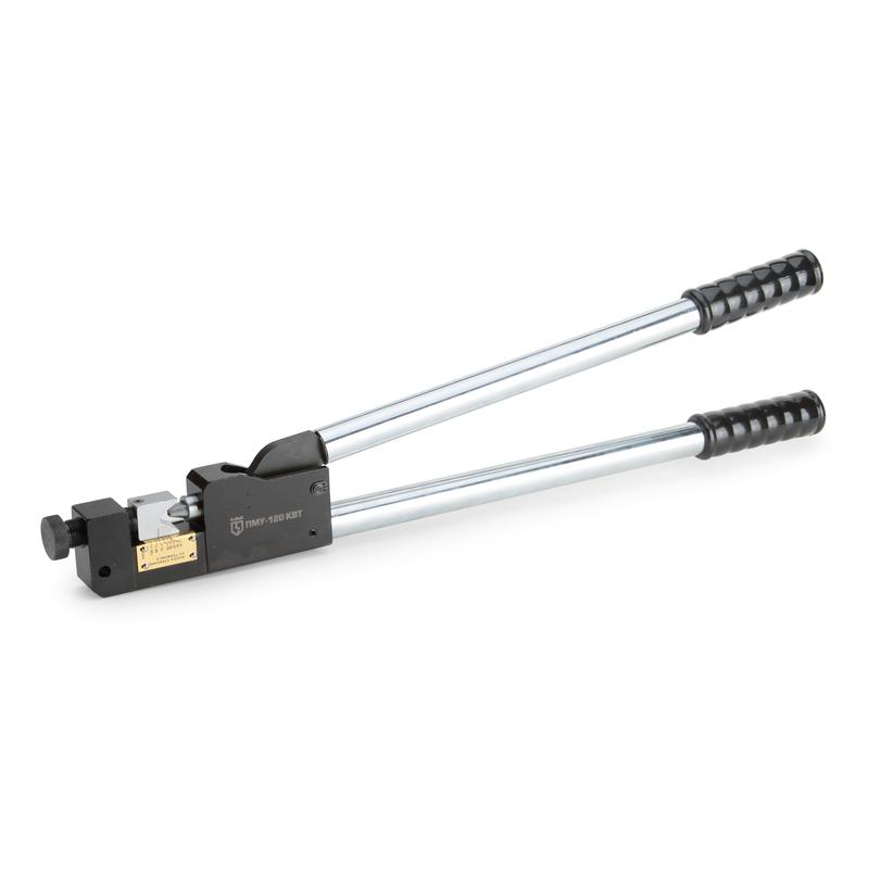 Описание Предназначен для клиновидной опрессовки наконечников из меди и алюминия. Инструмент имеет встроенную V-образную матрицу. Пресс изготовлен из прочной стали, на конце расположены удобные для захвата рукоятки. При помощи установочного винта, который расположен в верхней части инструмента, можно быстро установить необходимый типоразмер.