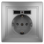 Описание Розетка с заземлением 2P+E Schuko со шторками, 16А-250В + 2хUSB 5В-2,1А, IP20, СУ, алюминий Intro Plano 1-410-03.