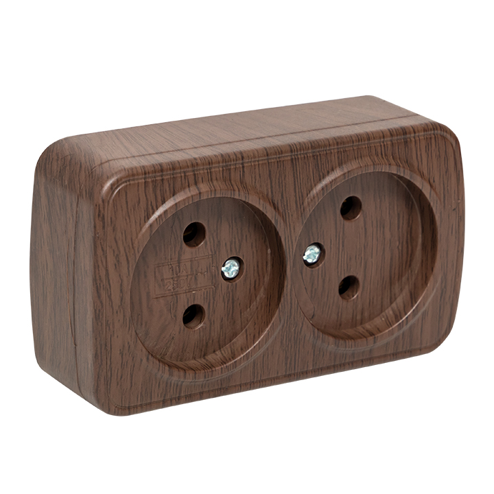 Наименование в каталоге Розетка 2-местная ОП Минск 10А без заземления темное дерево