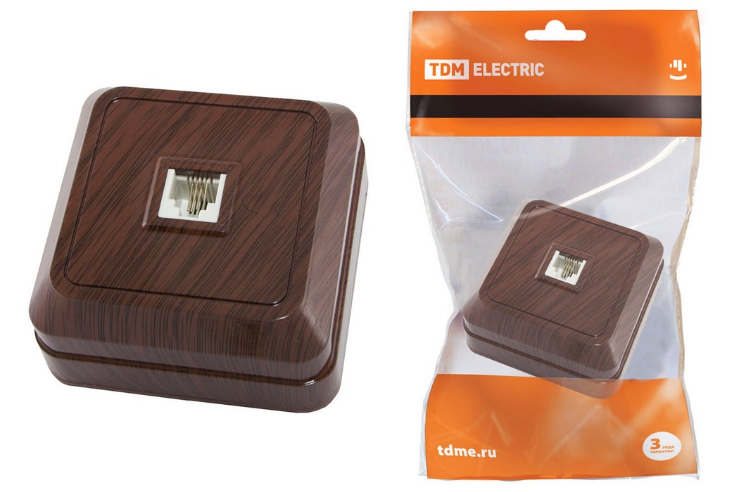 Наименование в каталоге Розетка TФ (RJ-11) открытой установки IP20, бук Ладога