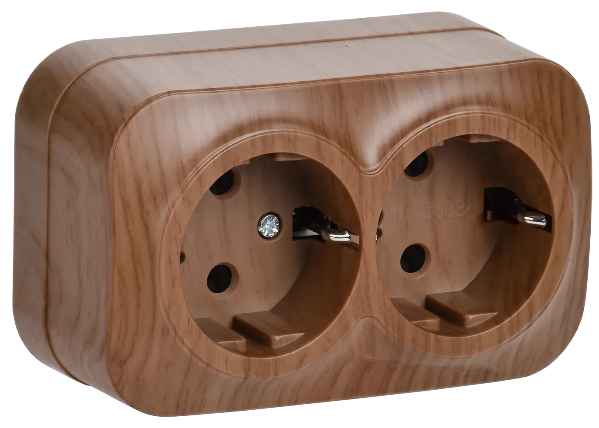 Наименование в каталоге GLORY Розетка двухместная наружная с заземлением дуб