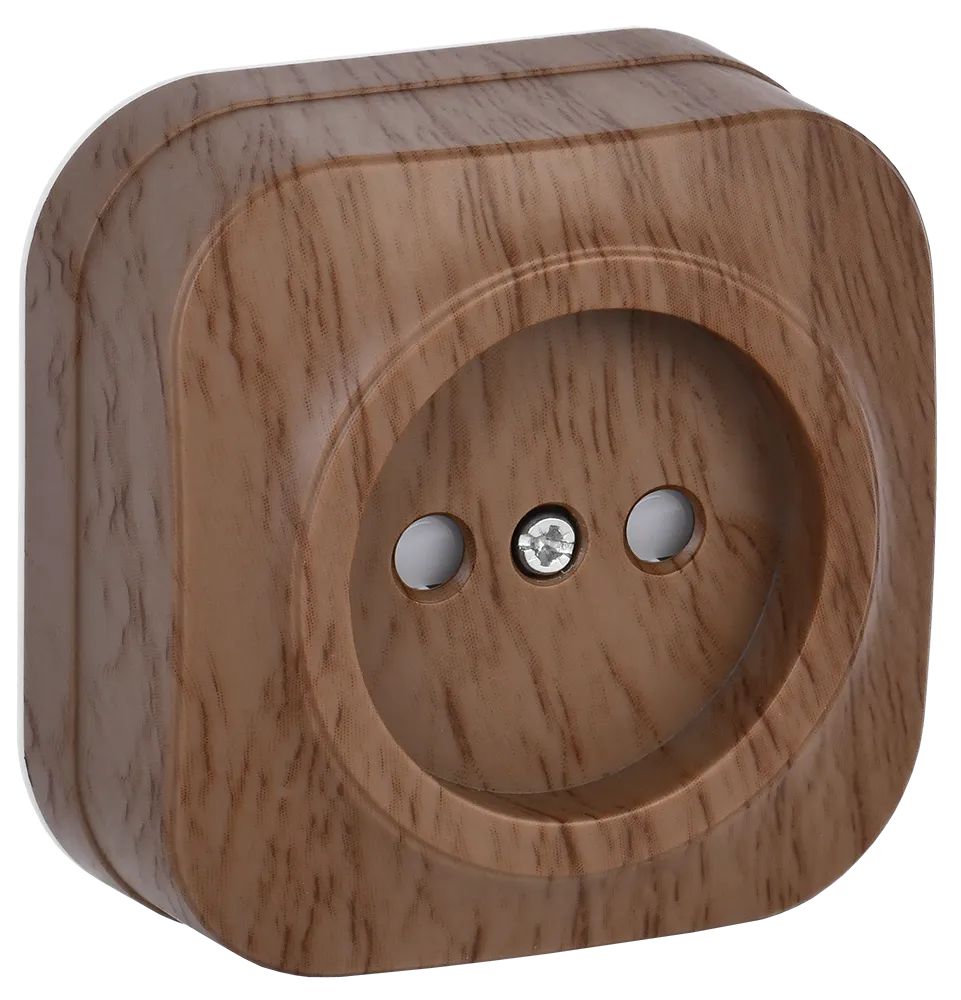 Наименование в каталоге GLORY Розетка одноместная наружная без заземления с защитной шторкой дуб