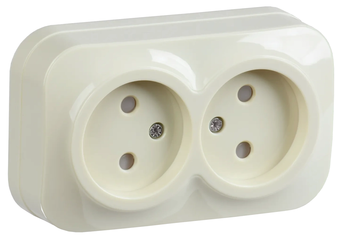 Наименование в каталоге GLORY Розетка двухместная наружная без заземления с защитной шторкой кремовая