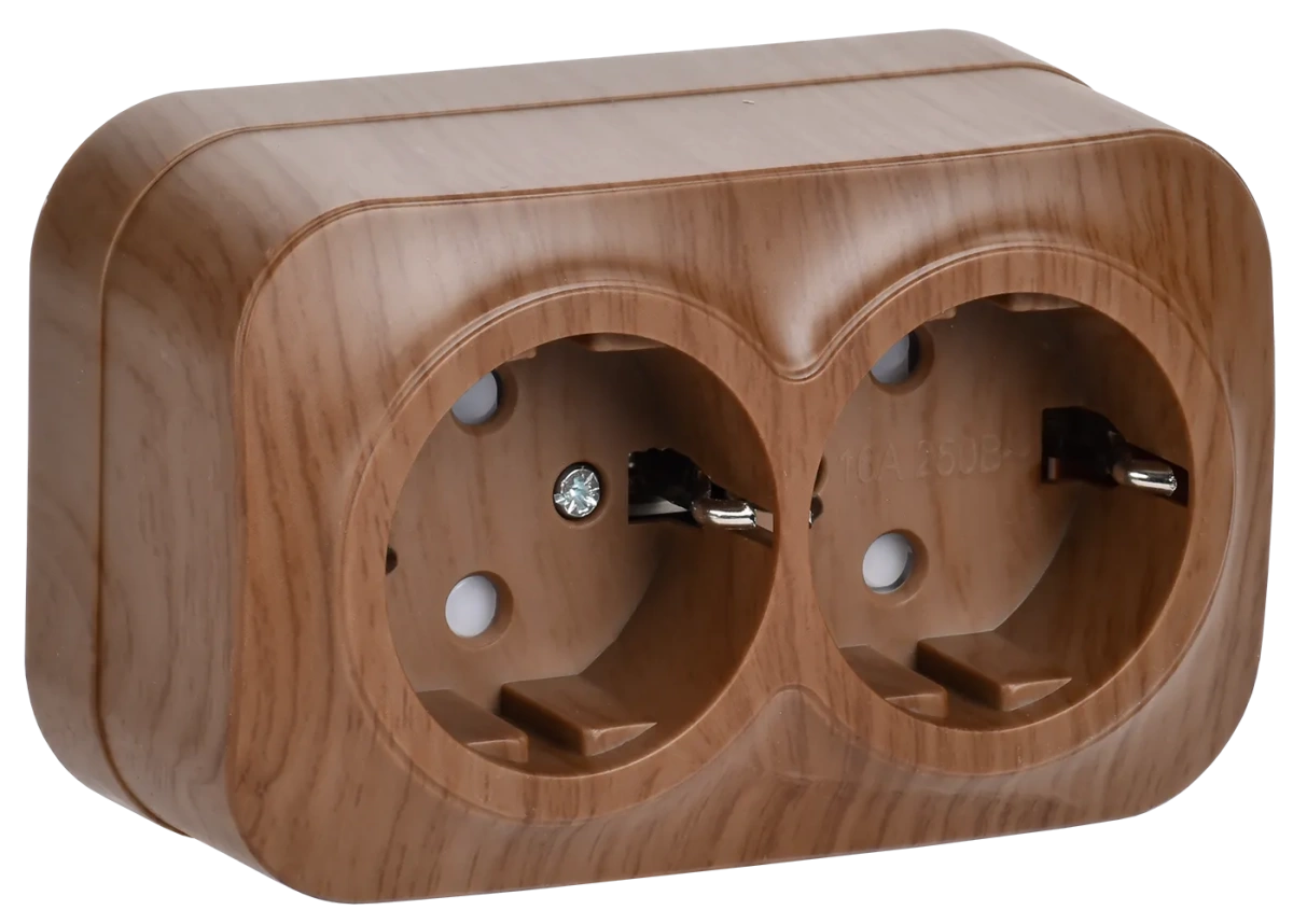 Наименование в каталоге GLORY Розетка двухместная наружная с заземлением с защитной шторкой дуб
