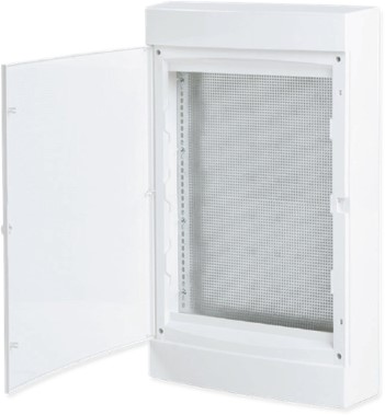 Описание Корпуса пластиковые серии «Unix IP40» предназначены для сборки силовых распределительных и слаботочных щитов. На DIN-рейки устанавливается модульное оборудование. На монтажные платы - антенные разветвители, Wi-Fi роутеры, патч-панели и иное слаботочное оборудование. Щиты устанавливаются на поверхность стены. Ассортимент корпусов с din-рейками представлен размерами вместимостью до 72 модулей, по 12 или 18 модулей в ряду, с белой глухой или прозрачной тонированной дверью, с DIN-рейками или перфлорированными монтажными платами. Особенностью корпусов является плоское основание, упрощающее сборку и подключения внутри, лицевая панель Корпуса изготовлены из качественного глянцевого ABS-пластика, имеют минималистичный дизайн и впишутся в большинство интерьеров.