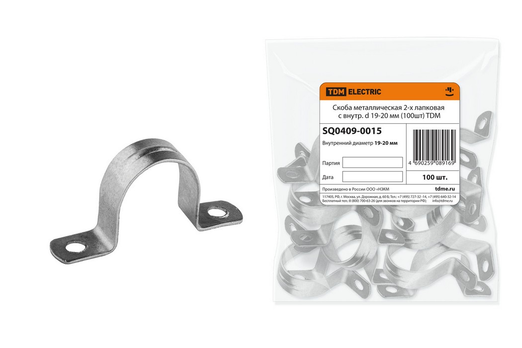 Полные технические характеристики Скоба металлическая 2-х лапковая с внутренним d 19-20 мм (100шт) TDM ELECTRIC SQ0409-0015