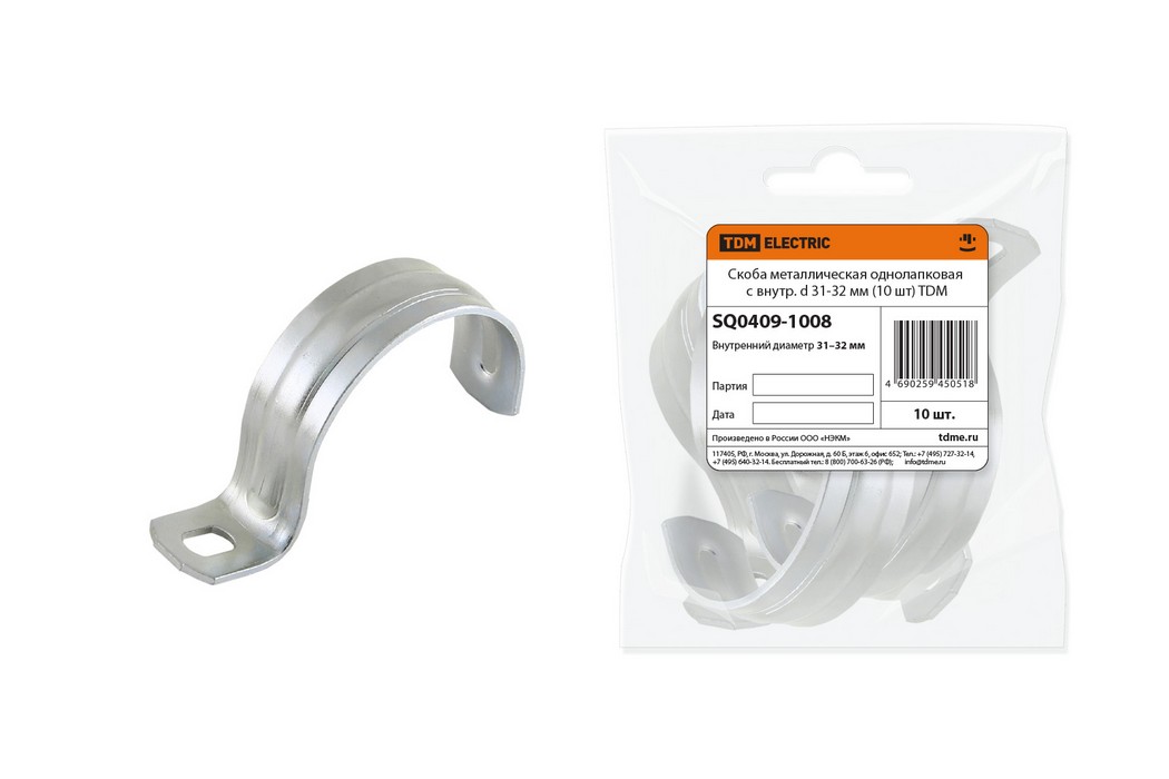 Полные технические характеристики Скоба металлическая однолапковая с внутренним d 31-32 мм (10 шт) TDM ELECTRIC SQ0409-1008