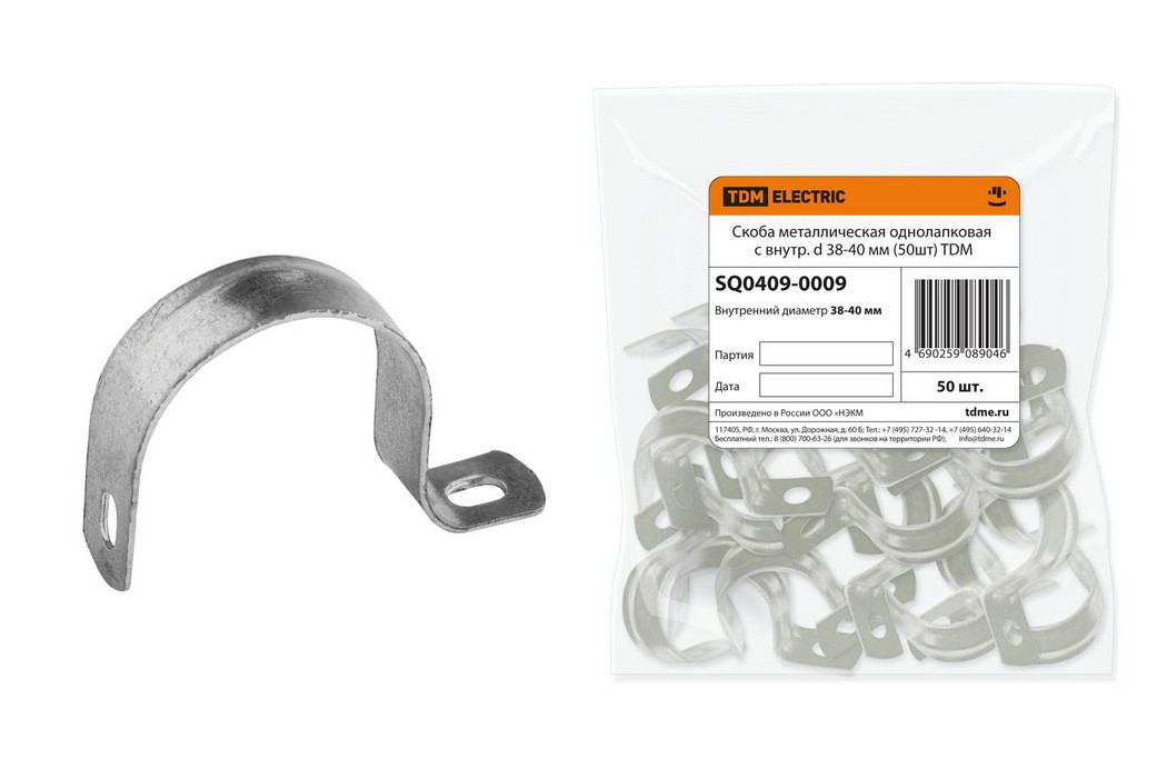 Полные технические характеристики Скоба металлическая однолапковая с внутренним d 38-40 мм (50шт) TDM ELECTRIC SQ0409-0009