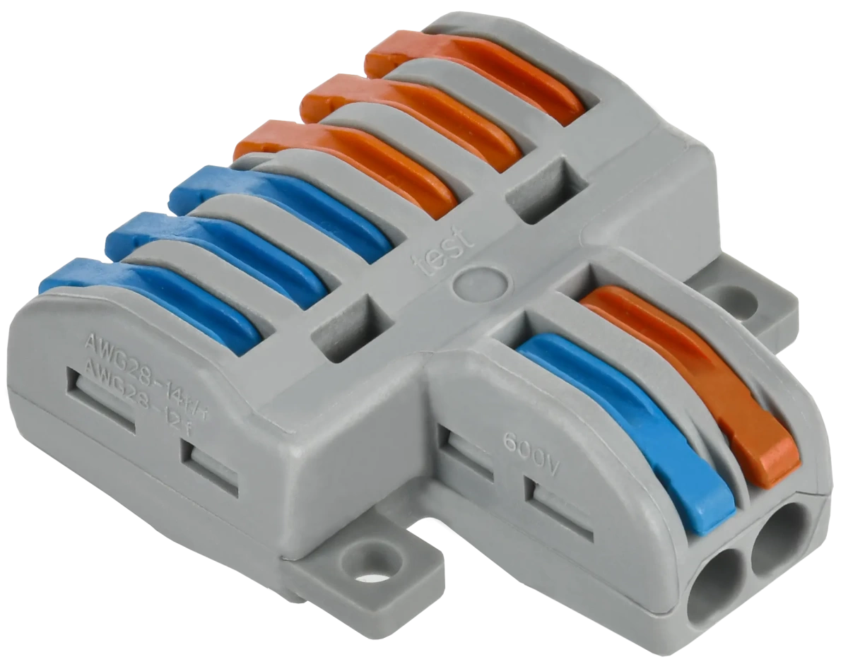 Описание Клемма строительно-монтажная проходная разветвительная серии 222 предназначена для соединения одножильных и многожильных медных проводников без использования инструмента в электрических сетях переменного и постоянного тока. Клемма допускает многократное присоединение и отсоединение проводников. Количество подключаемых проводников - 2/6.