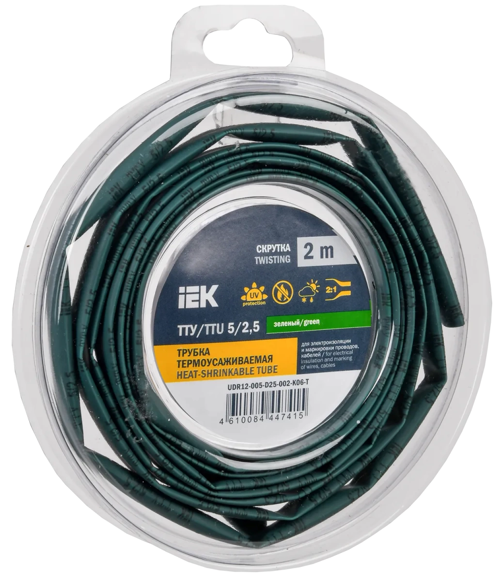 Полные технические характеристики Трубка термоусадочная ТТУ нг-LS 5/2,5 зеленая (2м/упак) IEK IEK (ИЭК) UDR12-005-D25-002-K06-T