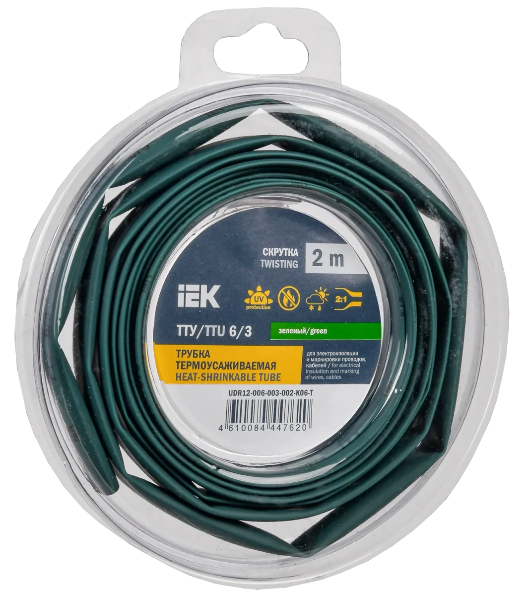 Полные технические характеристики Трубка термоусадочная ТТУ нг-LS 6/3 зеленая (2м/упак) IEK IEK (ИЭК) UDR12-006-003-002-K06-T