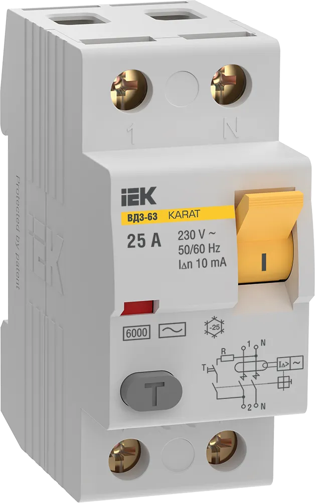 Выключатель дифференциальный (УЗО) KARAT ВД3-63 2P 25А 10мА 6кА тип AC IEK (ИЭК) MDV20-2-025-010