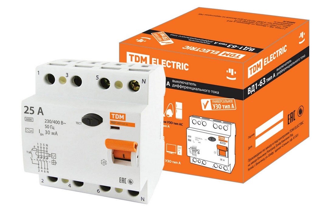 Устройство защитного отключения ВД1-63 четырехполюсный 25А 30мА тип А TDM ELECTRIC SQ0203-0085