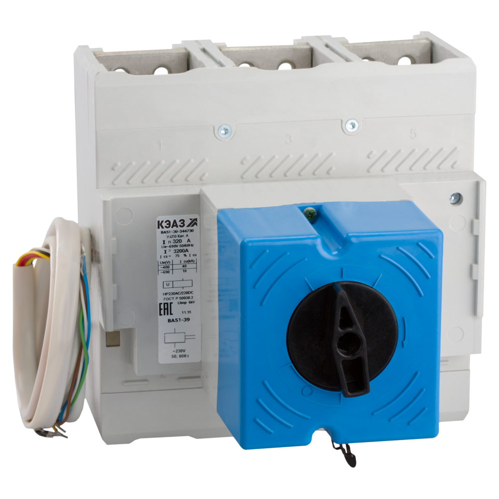 Описание Силовой 3 полюсный автоматический выключатель переменного тока в литом корпусе на номинальный ток 800 А. Трехполюсные автоматические выключатели КЭАЗ типа ВА 51-39 предназначены для применения в электрических цепях с напряжением 400 / 690 В переменного тока частотой 50 и 60 Гц и 440В постоянного тока, их защиты от токов короткого замыкания, токов перегрузки, недопустимых снижений напряжения, а также для нечастых оперативных включений и отключений.