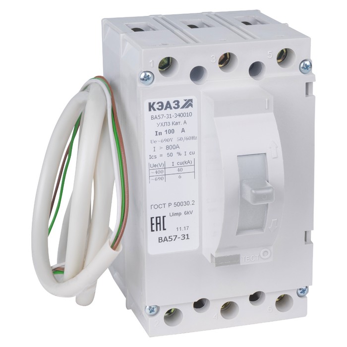 Описание Силовой 3 полюсный автоматический выключатель переменного тока в литом корпусе на номинальный ток 100 А. Трехполюсные автоматические выключатели КЭАЗ типа ВА 57-31 предназначены для применения в электрических цепях с напряжением до 220 постоянного / 690 В переменного тока частотой 50 и 60 Гц, их защиты от токов короткого замыкания, токов перегрузки, проведения тока в нормальном режиме и нечастых оперативных включений и отключений.