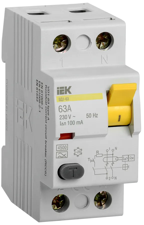 Выключатель дифференциальный тока (УЗО) ВД1-63 2Р 63А 100мА тип А(Электромеханическое) IEK (ИЭК) MDV11-2-063-100