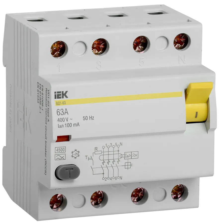 Наименование в каталоге Выключатель дифференциального тока (УЗО) ВД1-63 4Р 63А 100мА А(Электромеханическое)