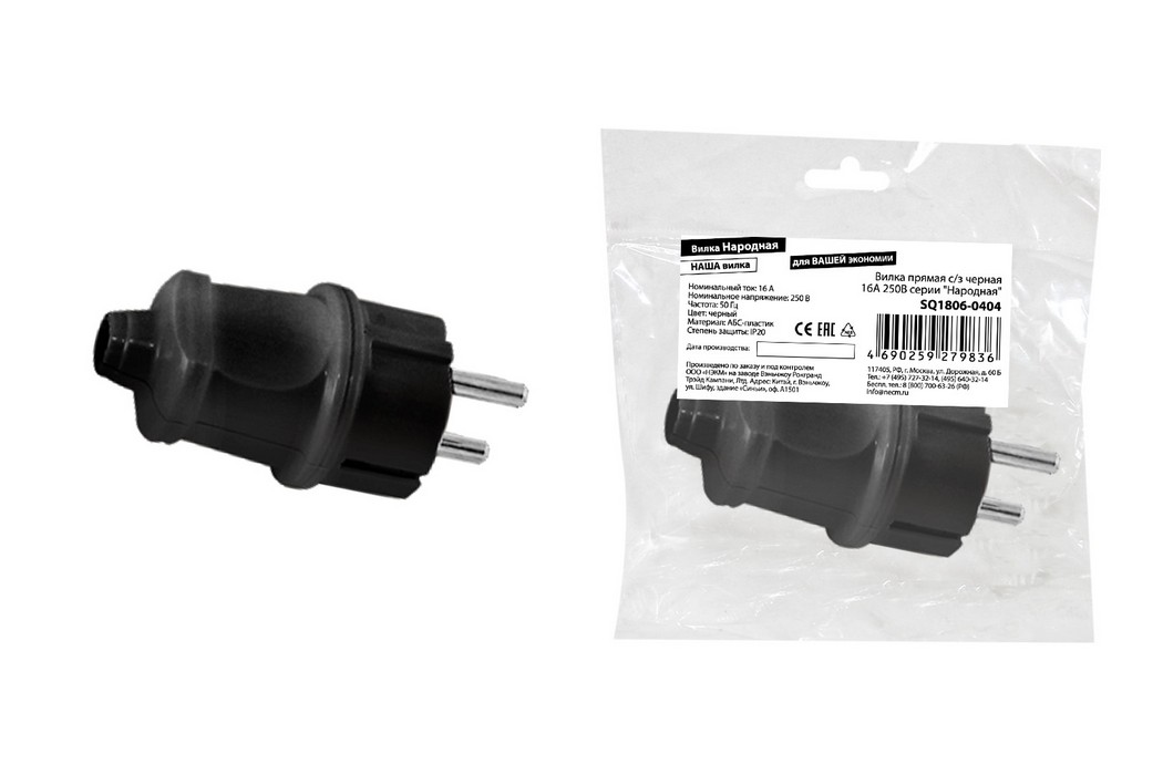 Наименование в каталоге Вилка прямая с заземлением черная 16А 250В серии Народная