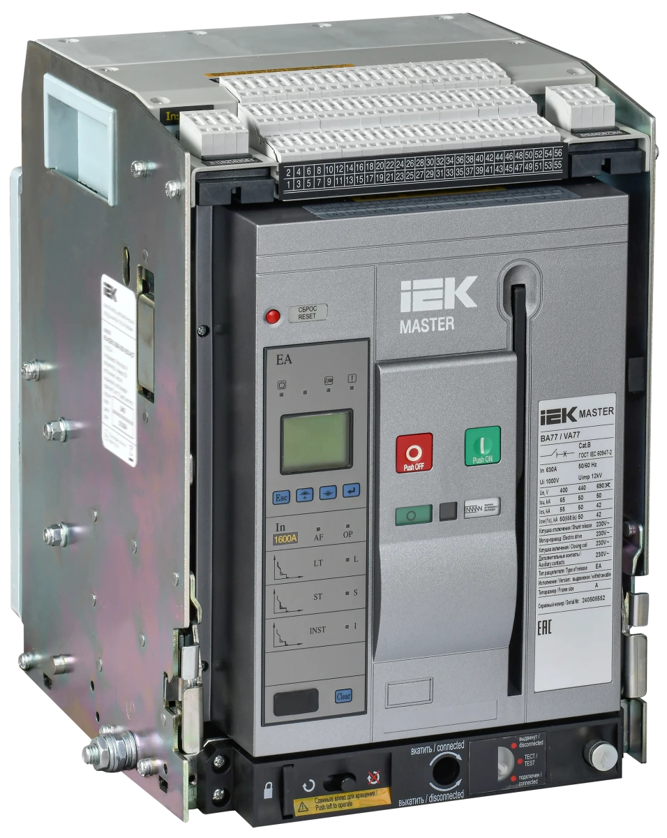 Полные технические характеристики Выключатель автоматический воздушный переменного тока ВА77 выдвижного исполнения 3 полюса типоразмер A 65кА 630А EA IEK (ИЭК) MI-ACB10-3WA-065-0630-ACF