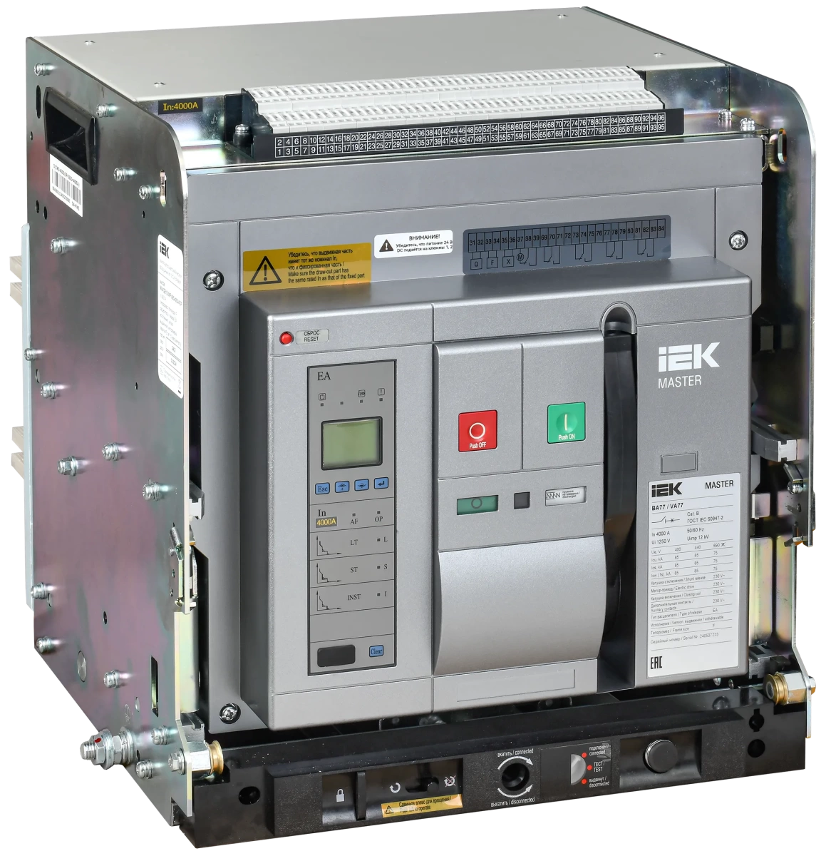 Полные технические характеристики Выключатель автоматический воздушный переменного тока ВА77 выдвижного исполнения 3 полюса типоразмер F 85кА 4000А EA IEK (ИЭК) MI-ACB10-3WF-085-4000-ACF