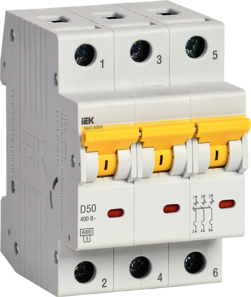 Полные технические характеристики Выкл. авт. ВА47-60МА без тепл. расцеп. 3P 50А 6кА D IEK (ИЭК) MVA33-3-050-D
